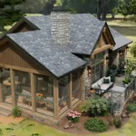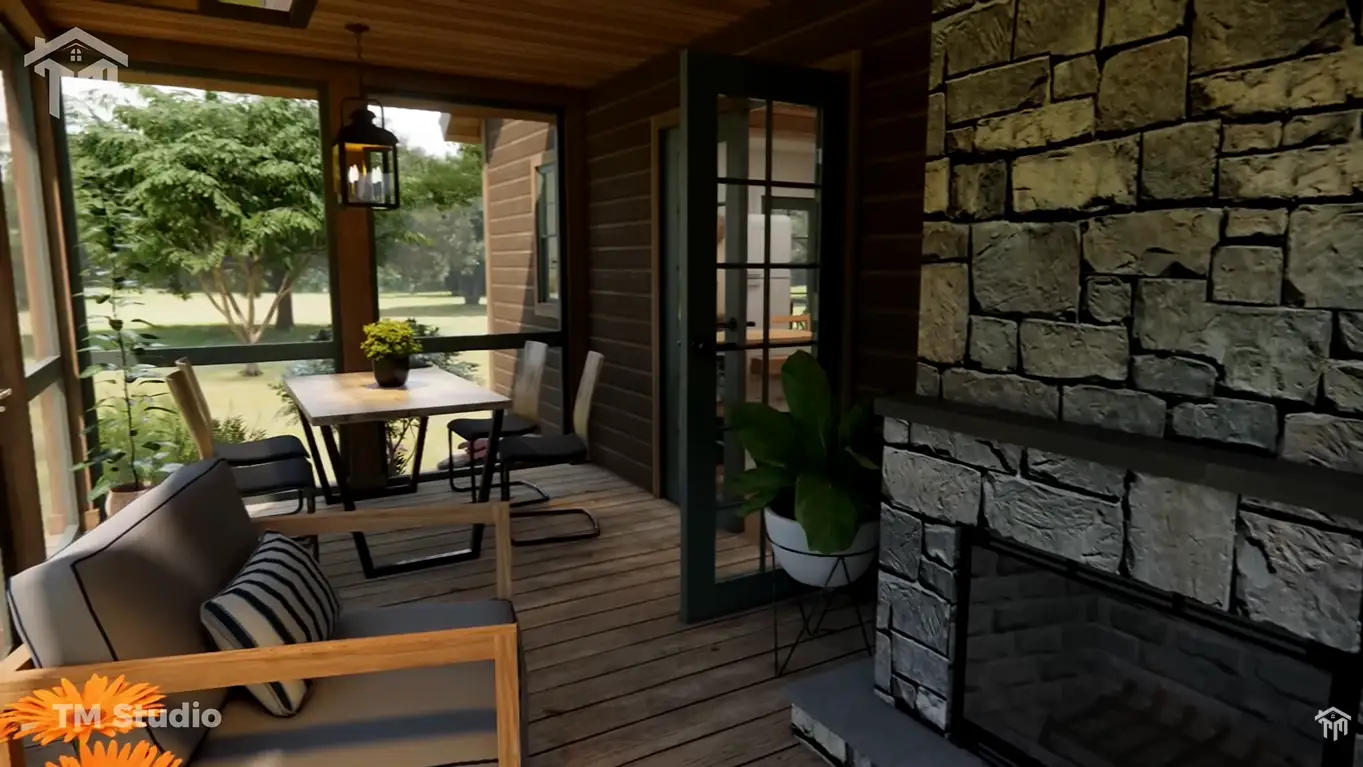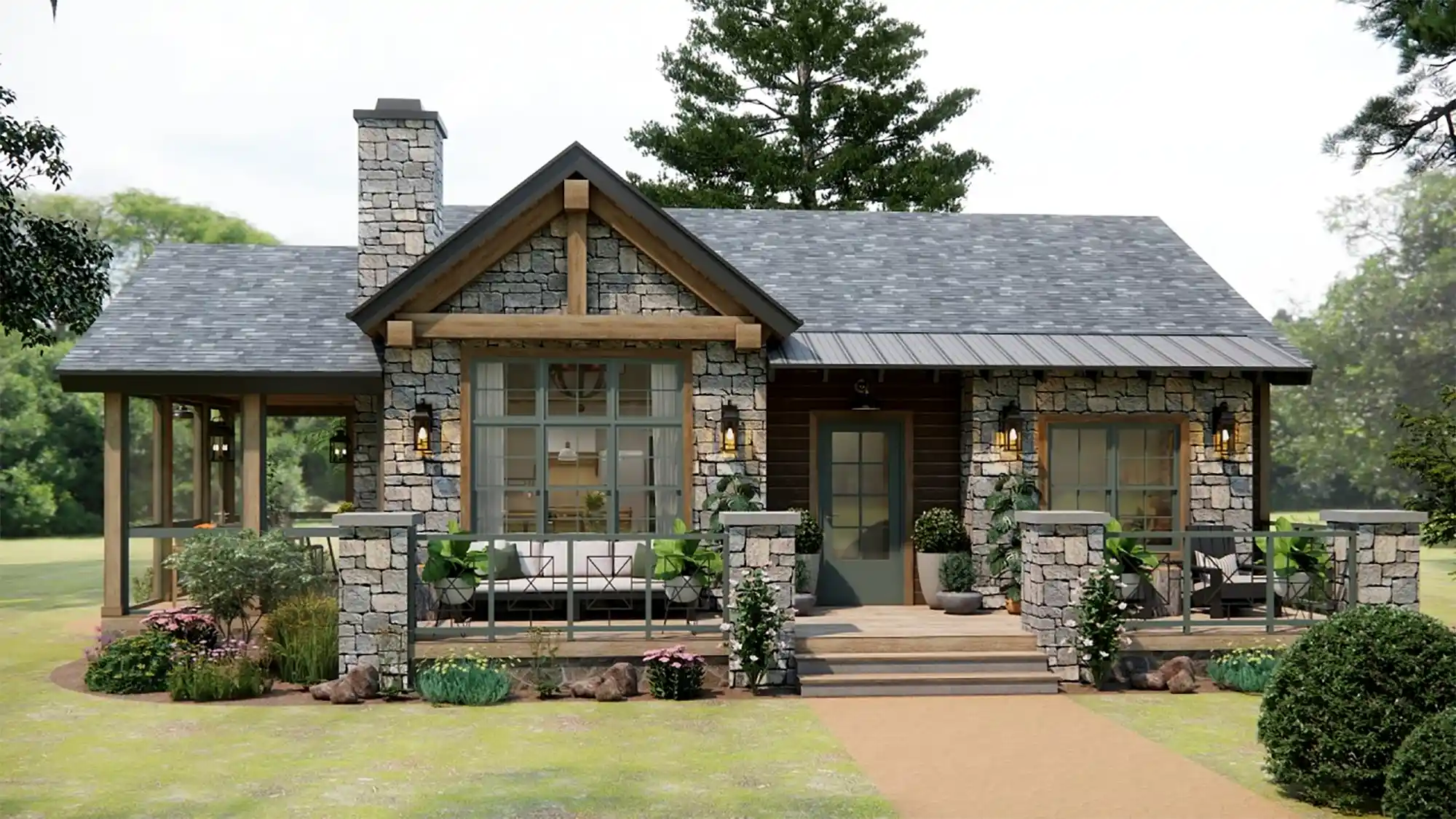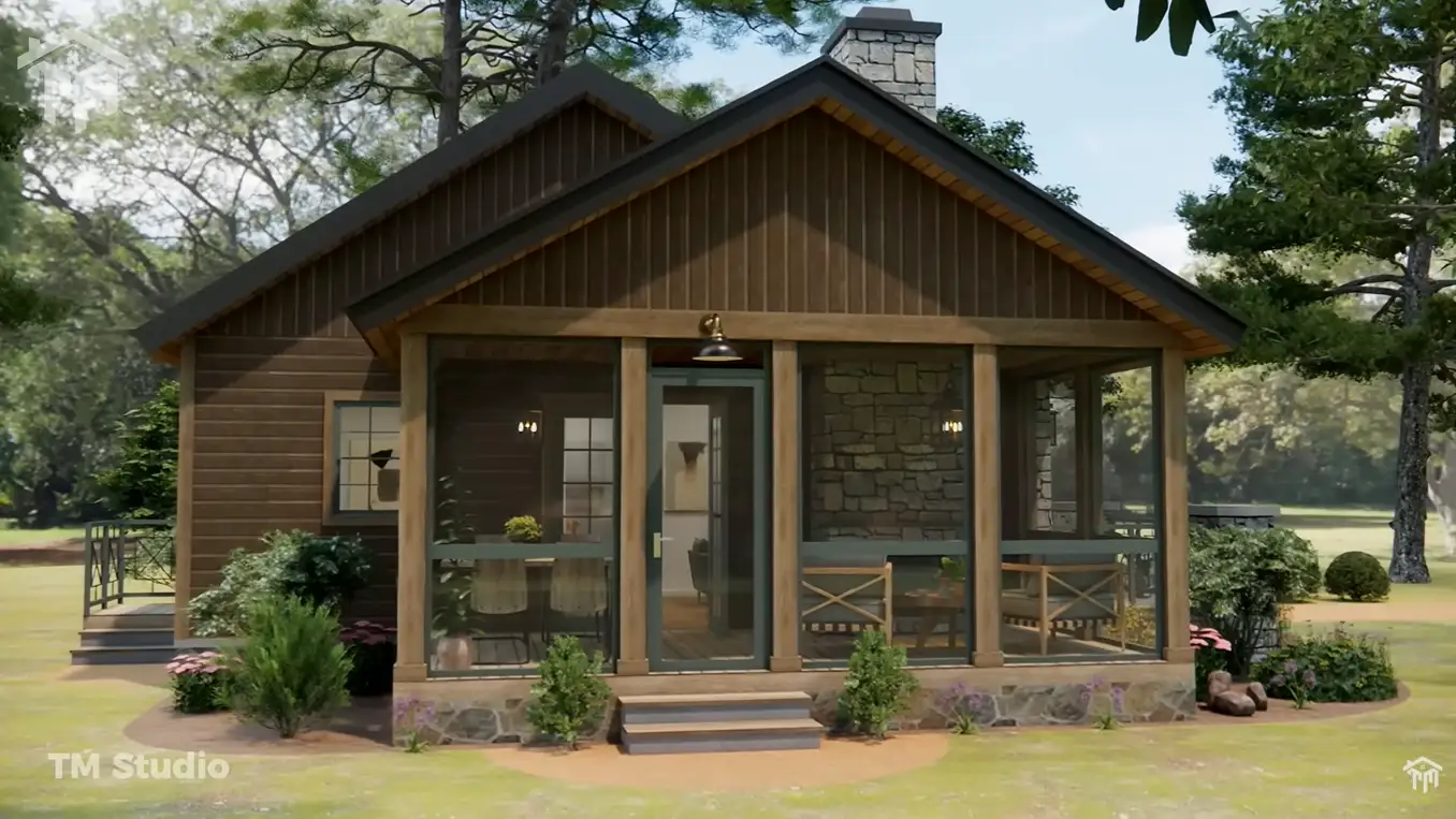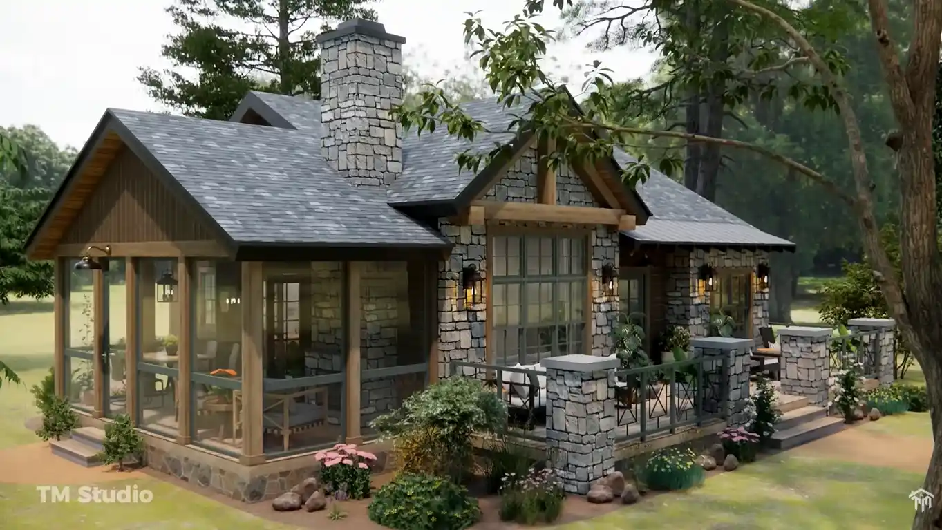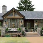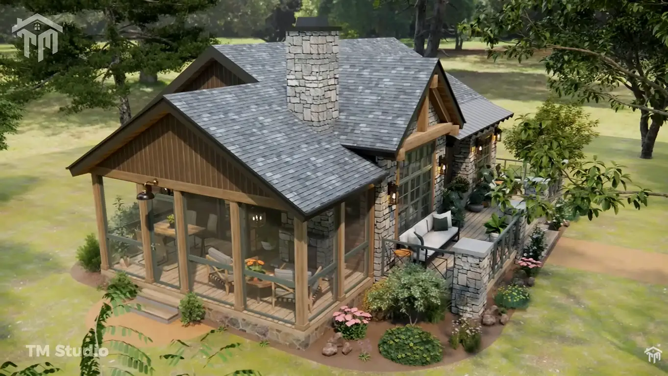 Outdoor living is a standout feature of this design, offering a screened porch and a spacious 313 sq ft deck—perfect for relaxing, enjoying nature, or hosting outdoor gatherings. The home’s rustic cottage exterior, accented with stone, wood framing, and a classic pitched roof, delivers stunning curb appeal that blends beautifully into natural surroundings.