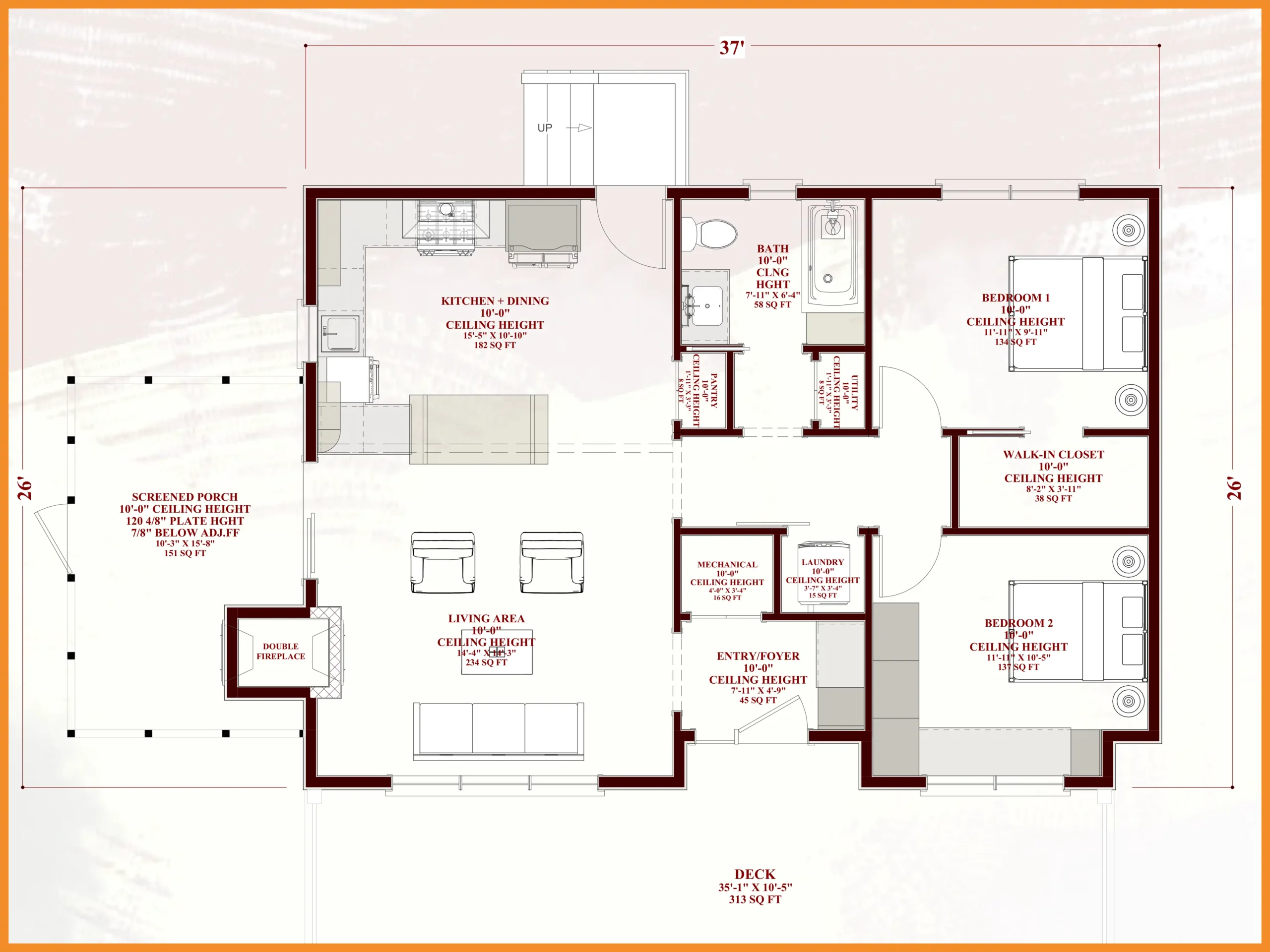 The layout features a bright open-concept living area with a welcoming double fireplace, creating a warm and inviting atmosphere. The kitchen and dining space boast 10-foot ceilings, enhancing the sense of openness while providing ample room for cooking, dining, and entertaining.