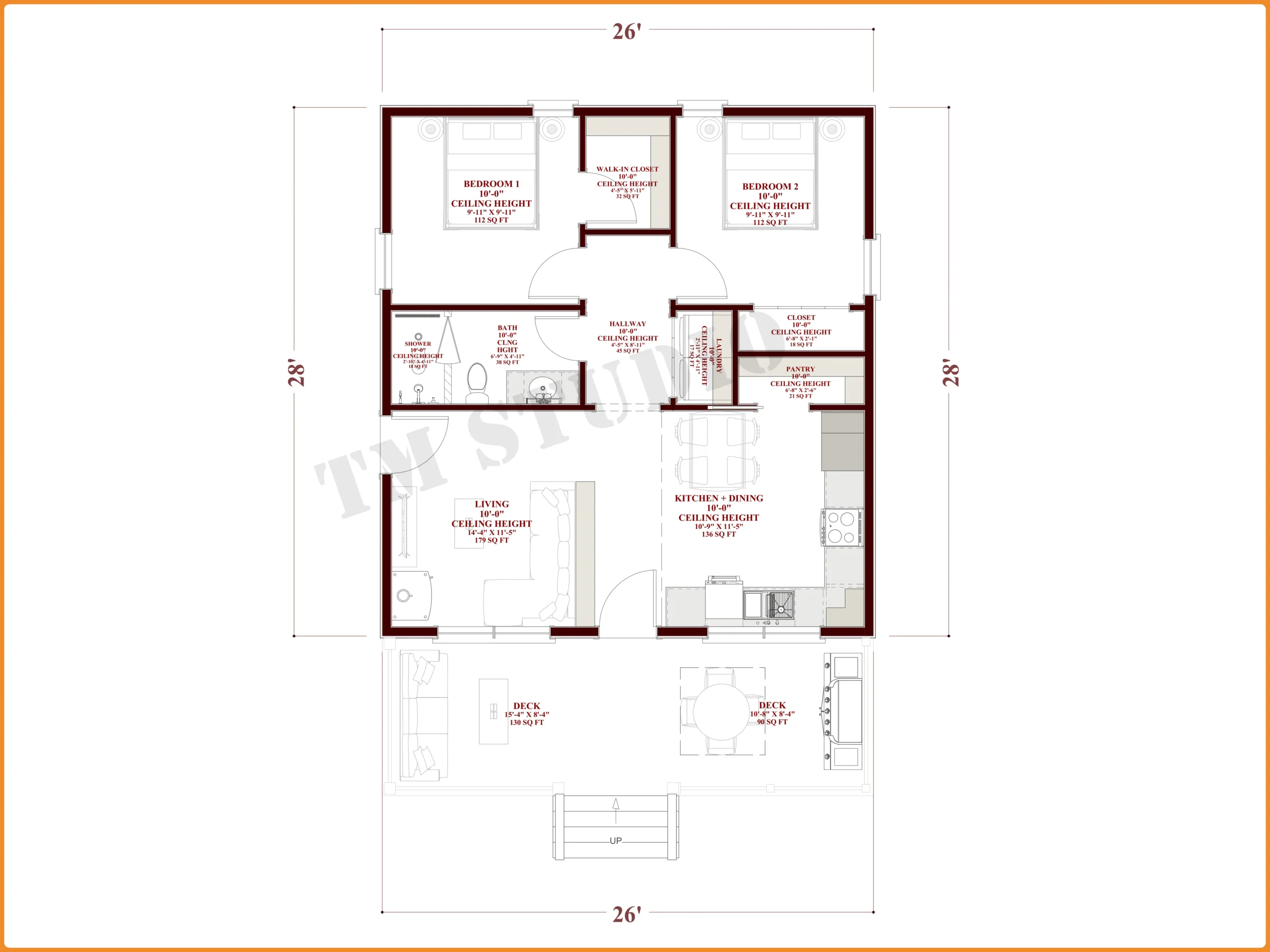 Looking for a charming, affordable small home that feels bigger than its footprint? The TMS-052-CF1 26’x28’ Cozy Country Cottage is a beautifully designed 2-bedroom small house plan offering 728 sq ft of heated living space with smart layout efficiency and strong structural specifications for US builders.