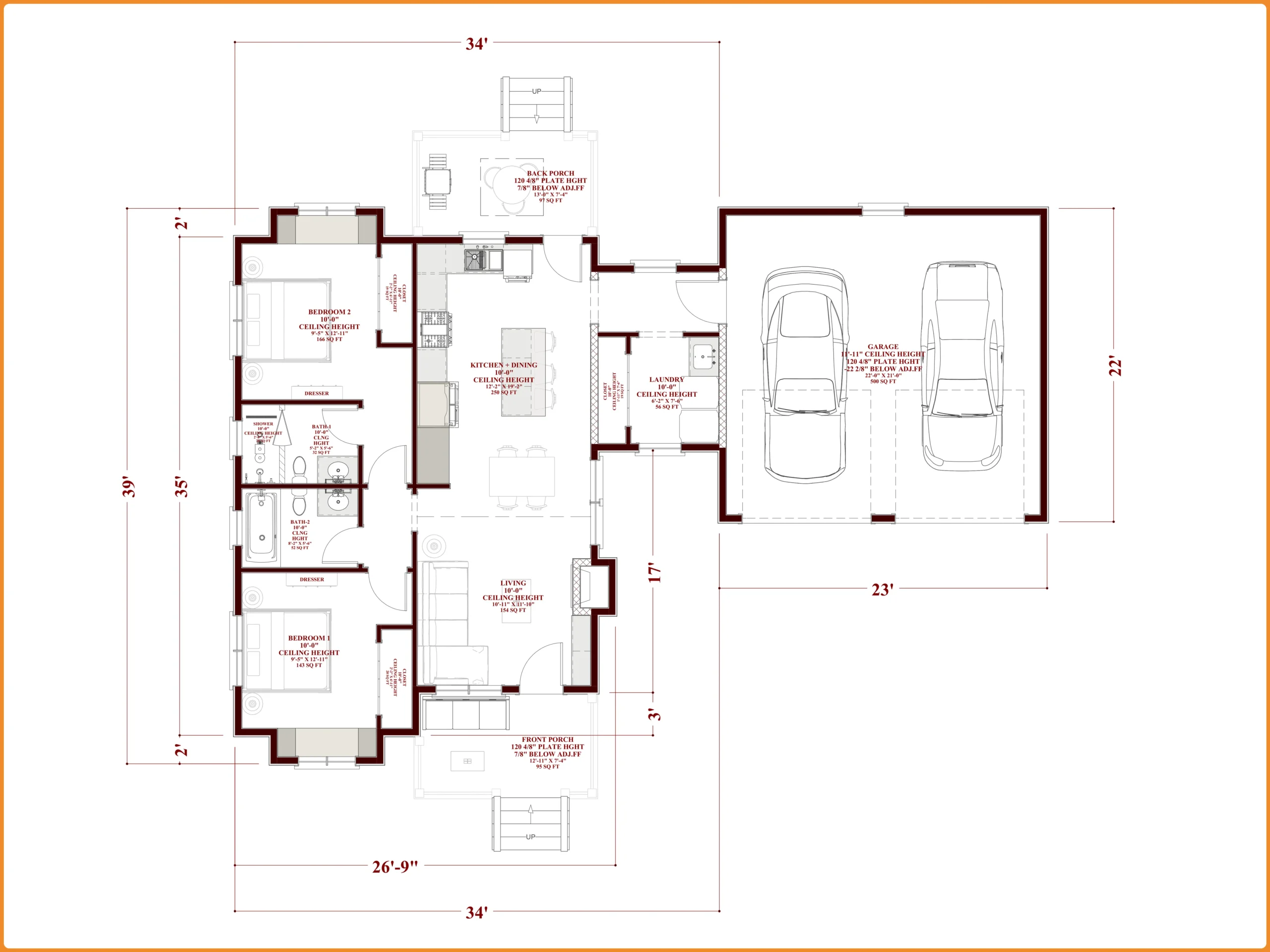 Designed by TM Studio-Small House Design, this thoughtfully planned 34’ x 39’ home offers 1,008 square feet of conditioned living space plus 692 square feet of garage space — making it ideal for first-time buyers, downsizers, retirees, or investment property builders across the United States.