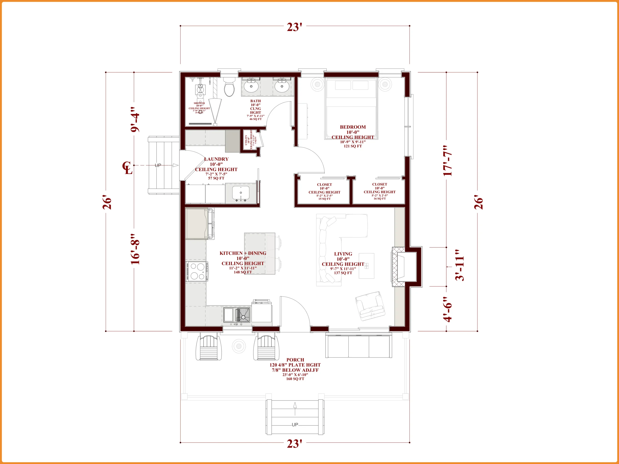 The 160 sq ft covered front porch (23’-0” x 6’-10”) adds functional outdoor space—perfect for morning coffee, evening relaxation, or enhancing curb appeal.