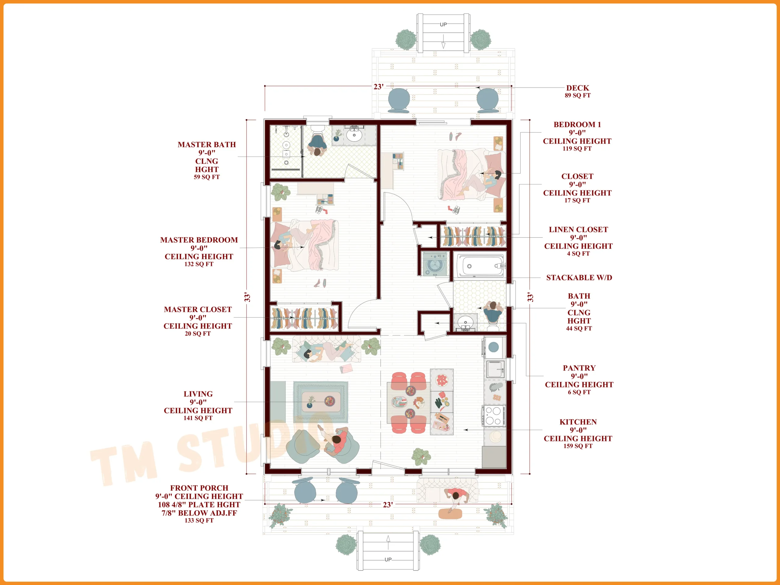 Built with 2×6 exterior framing, 2×4 interior walls, and a crawlspace foundation, this design aligns with standard US construction practices, offering durability and energy efficiency. The 9-foot ceiling height enhances the sense of space throughout the home.