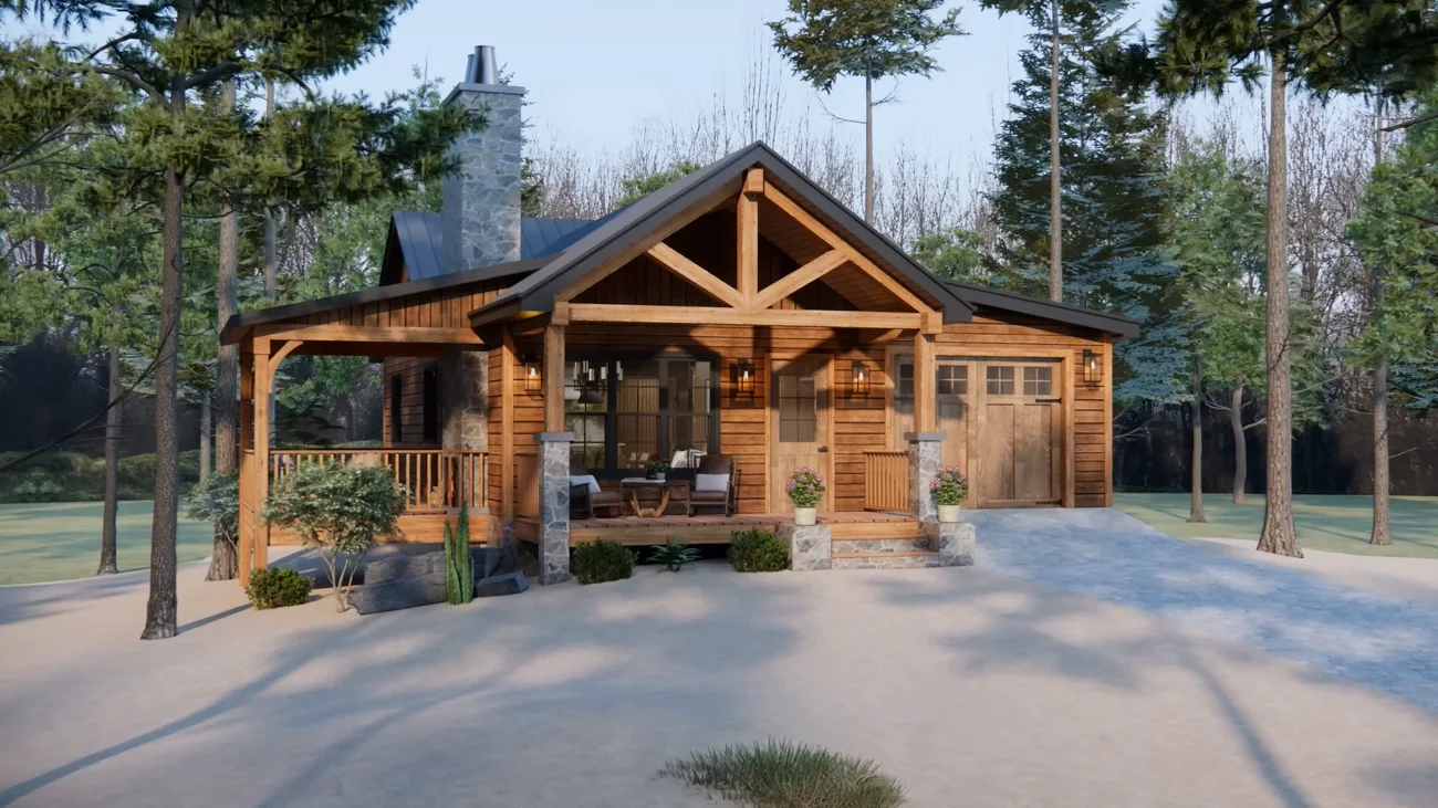 30’x42′ Cozy Wood Cabin Home Plan – Smart 2 Bedroom Layout with Garage | TMS-097-CF1