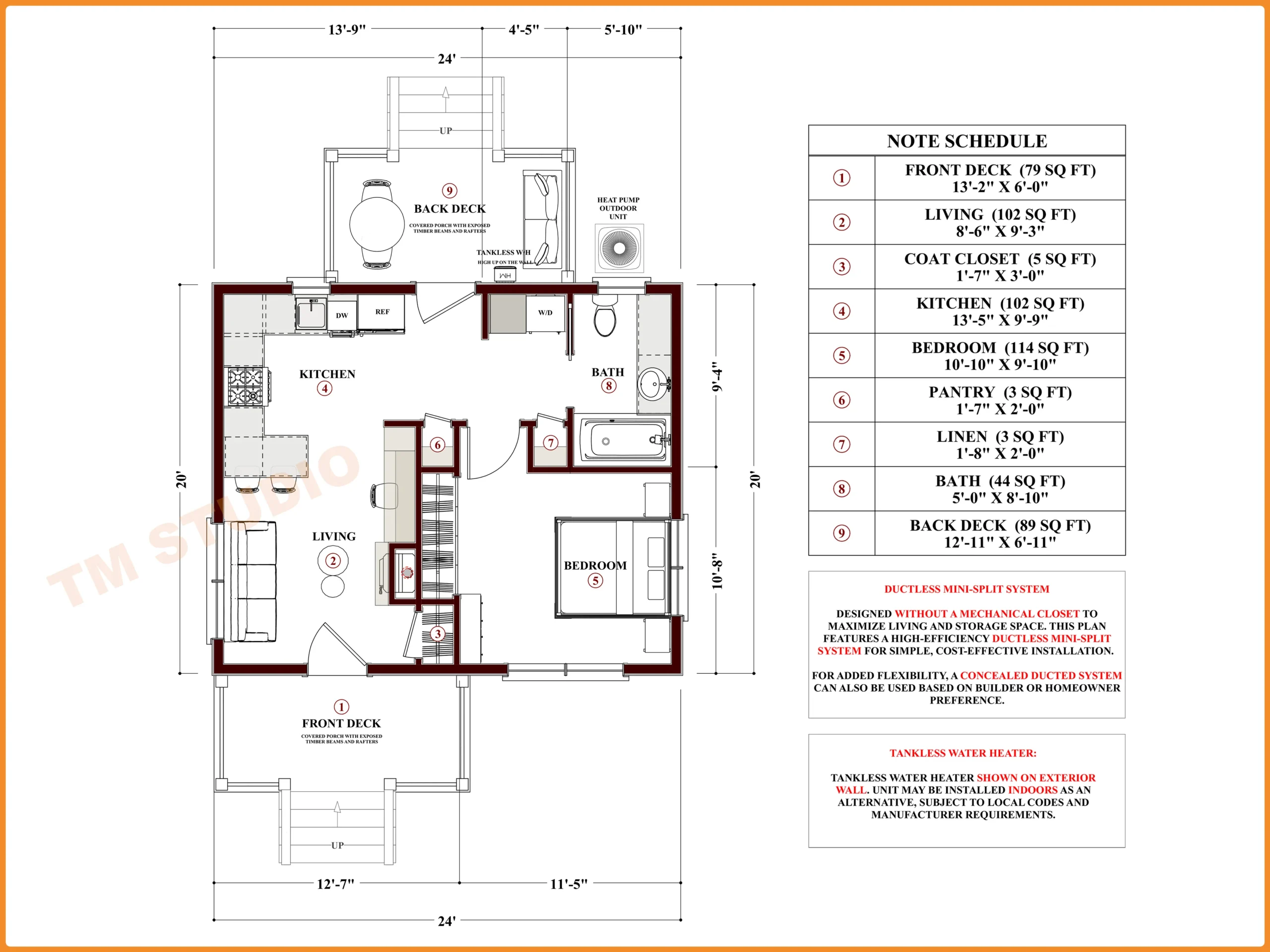 The TMS-099-CF1 tiny house floor plan by TM Studio-Small House Design is thoughtfully crafted for modern living, offering a highly functional 480 sq ft layout that feels open, bright, and surprisingly spacious.